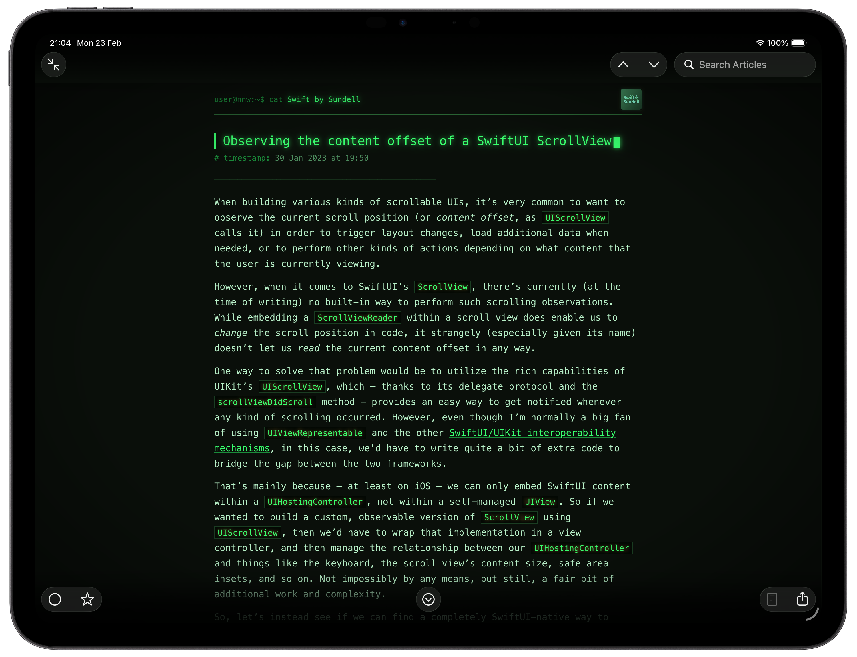 Matrix for NetNewsWire. Download link at the bottom of this article. The Mac gets a pretty cool, though subtle CRT effect.