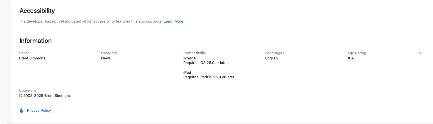 I went to the Mac App Store, and only found NetNewsWire via the link on your website, and it is not allowing me to download and showing “Not Compatible with this device” I just updated to 26.3, not sure if that has anything to do with it. Also under compatibility it only shows iPhone 26.0 or later and iPad 26.0 or later.